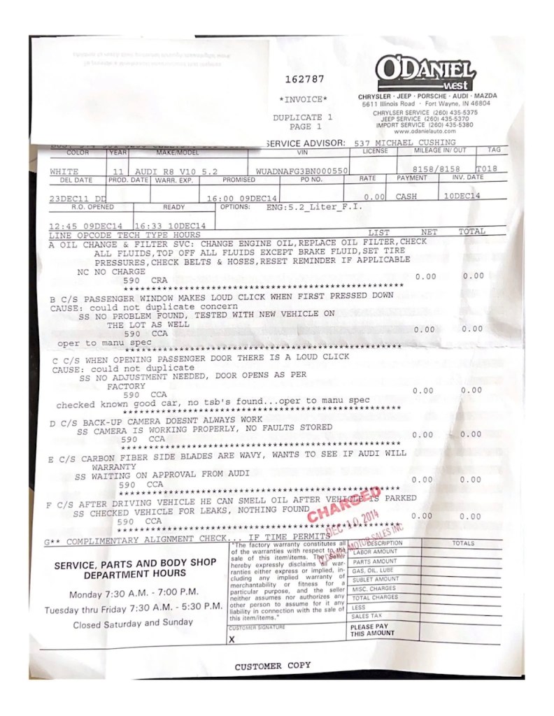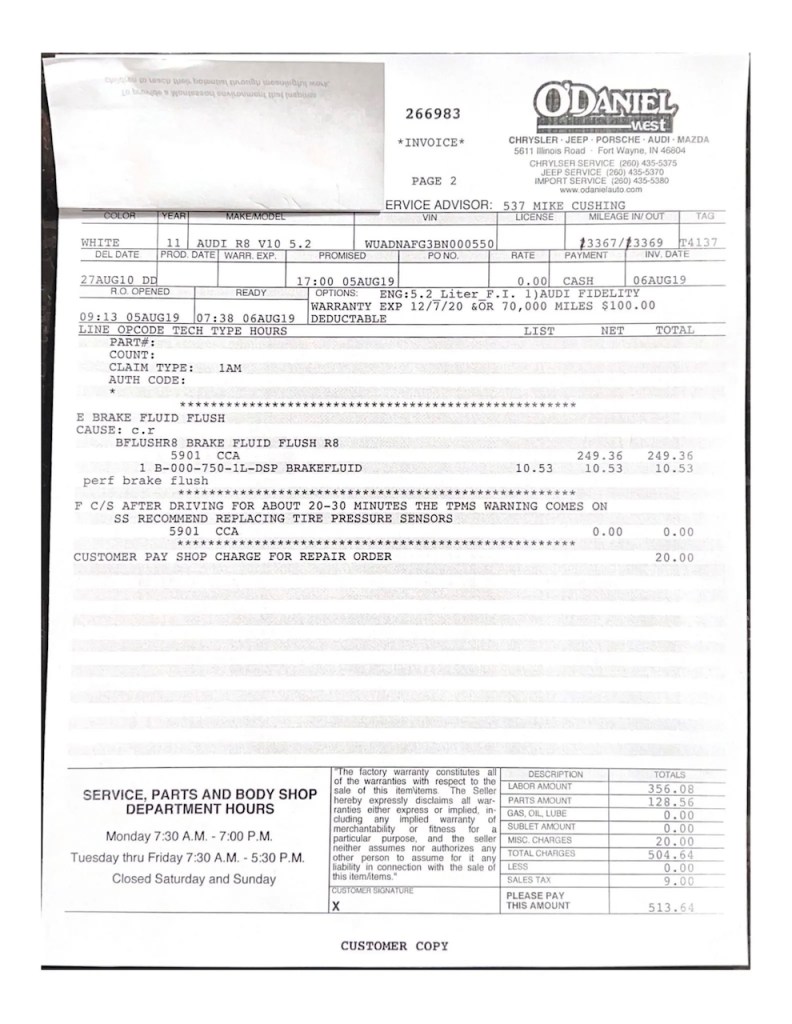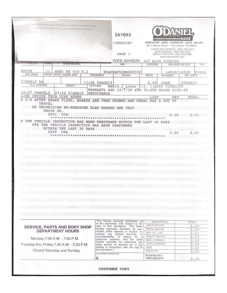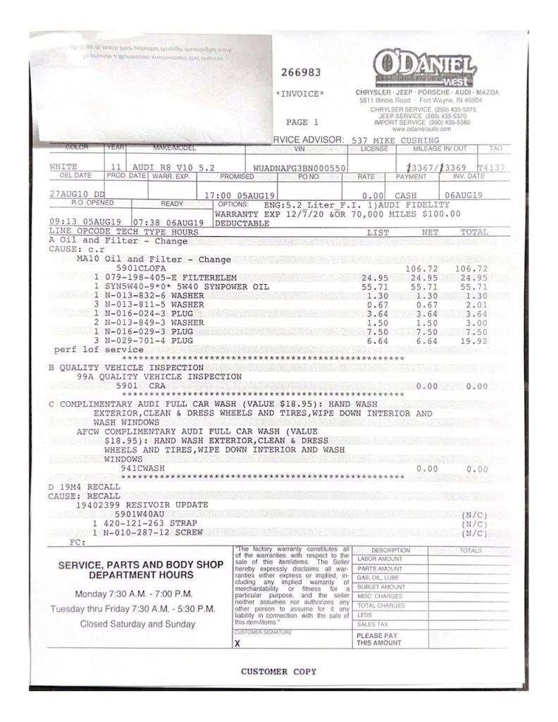 - August 2019 (14,369 miles): Maintenance inspection completed, brake fluid flushed/changed, engine oil and filter changed