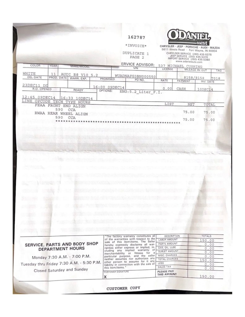 - July 2018 (13,880 miles): Maintenance inspection completed, two-wheel alignment performed, thrust angle alignment performed, engine oil and filter changed