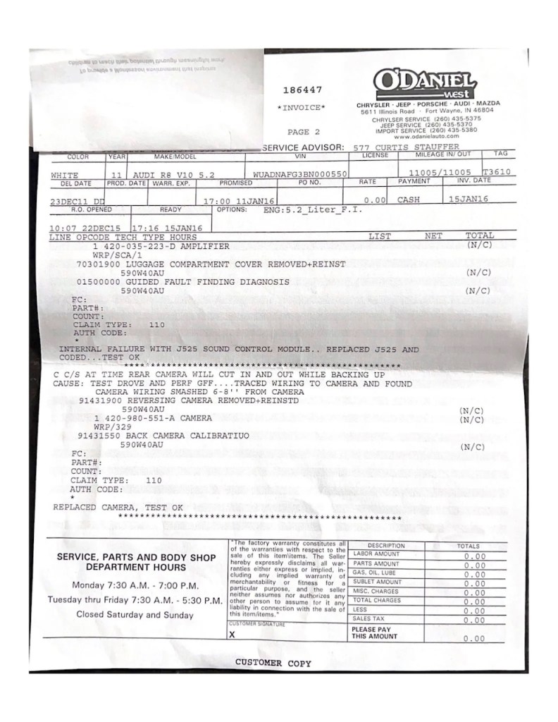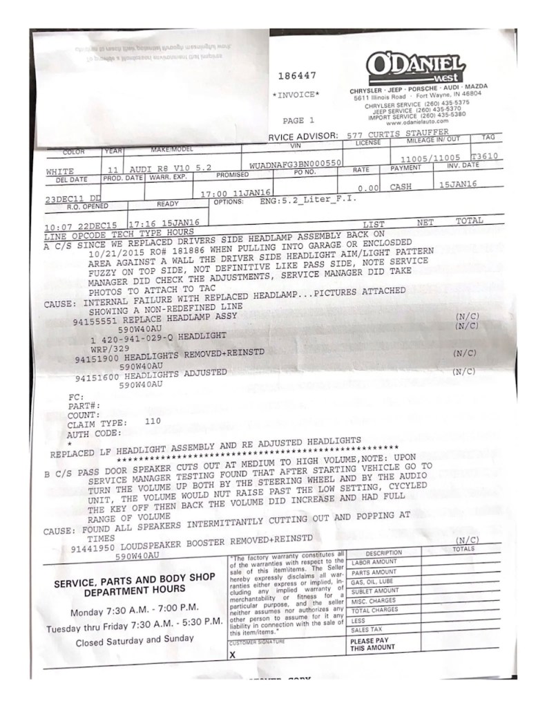 - January 2016 (11,005 miles): Engine/powertrain computer/module checked, headlights replaced, cargo cover installed