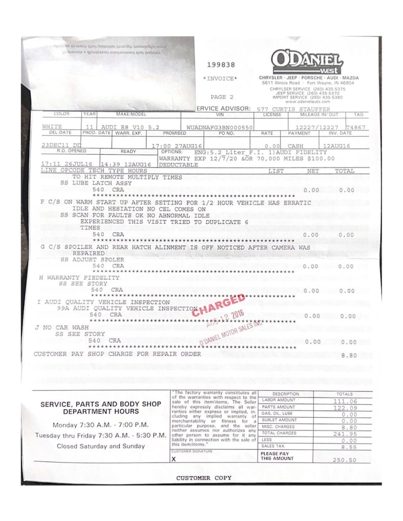 - August 2016 (12,227 miles): Engine oil and filter changed, body lubricated