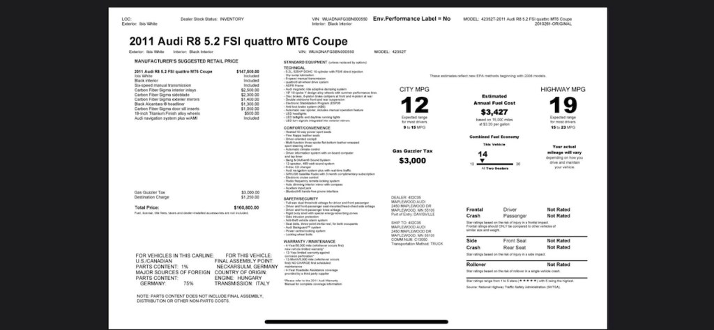 2011 Audi R8 V10 Coupe Manual, Ibis White, Black Interior, Carbon – $140K (Sold for 146K on Bring A Trailer)