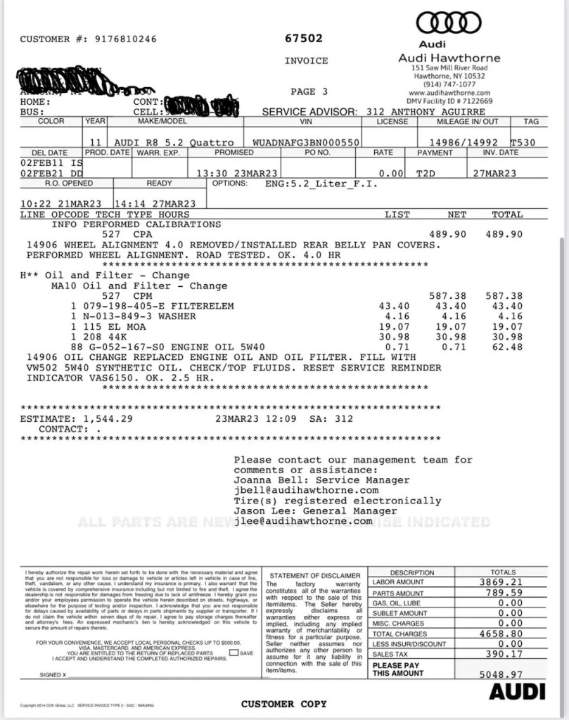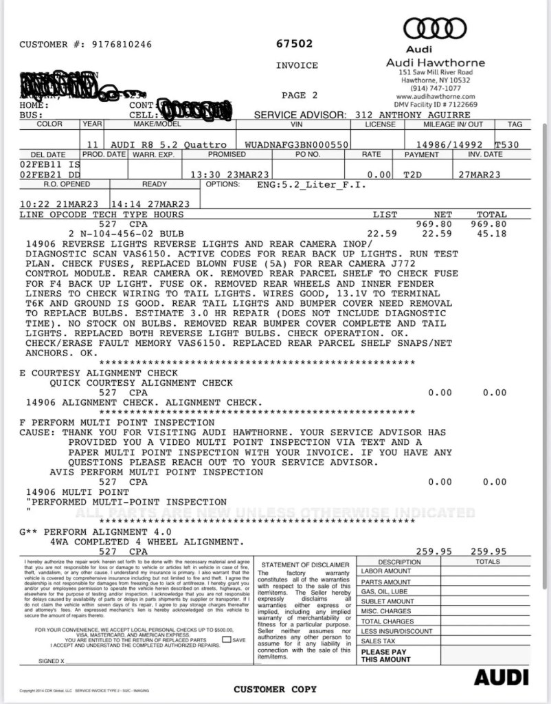 - March 2023 (14,992 miles): Maintenance inspection completed, four wheel alignment performed, engine oil and filter changed, battery replaced, fuses replaced, reverse bulbs replaced