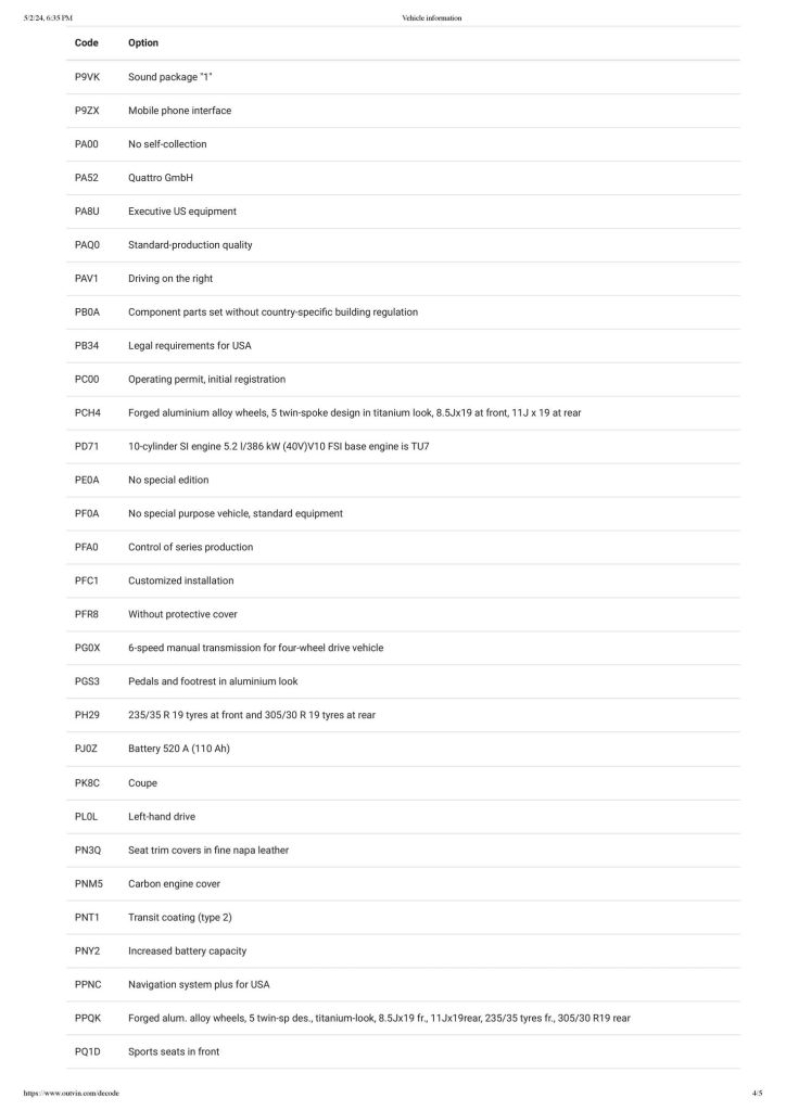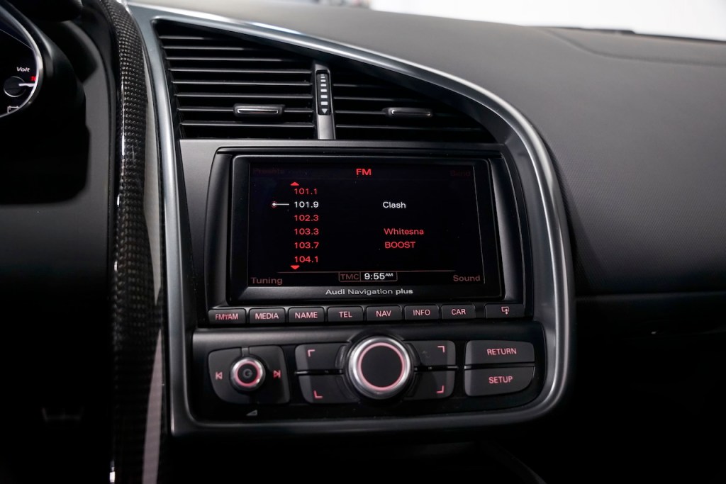 - Factory equipment includes Audi magnetic ride, Carbon Sigma sideblades, Nappa leather upholstery, Carbon Sigma inlays, power-adjustable and heated seats, automatic climate control, navigation system, and a Bang & Olufsen sound system