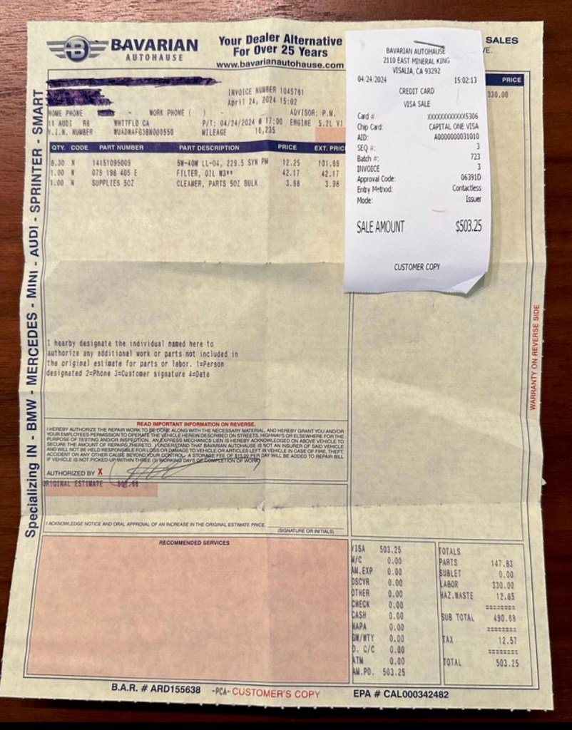- April 2024 (16,235 miles): Engine oil and filter changed
