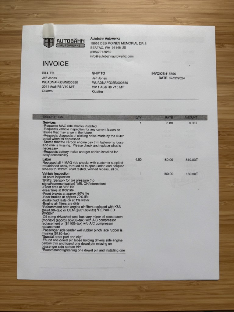 - July 2024 (16,976 miles): Mag ride shocks replaced with oem, carbon bits tightened in engine bay, trickle charger cable installed for easy accessibility, 18 point inspection, K&N air filters replaced with new K&N, troubleshoot clicking clutch noise (likely clutch master cylinder) – $1,854.10