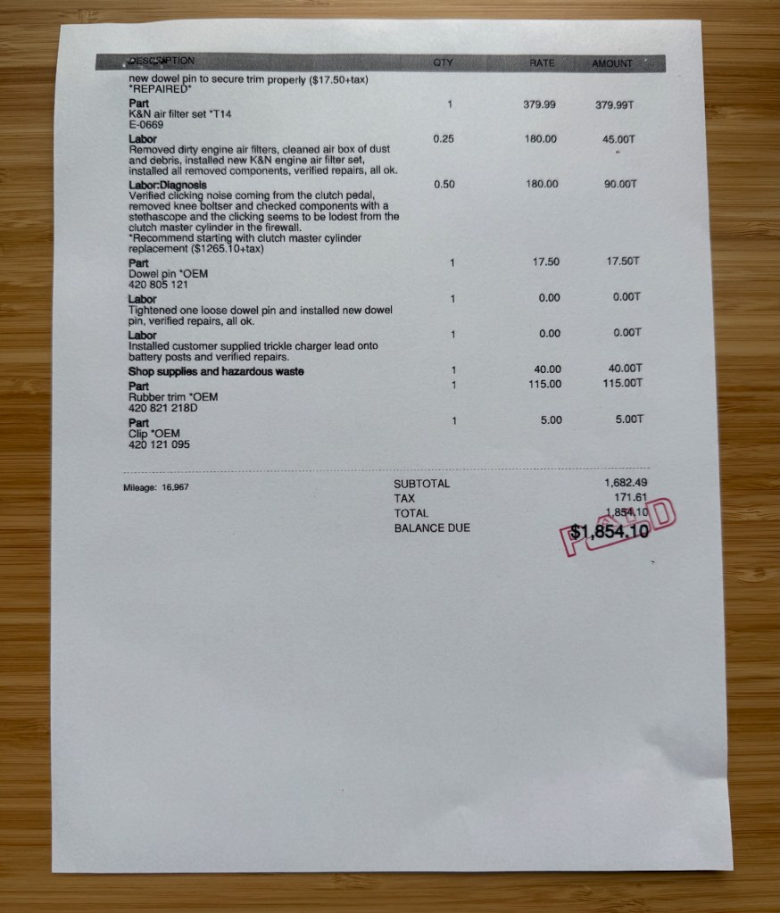 - March 2025 (17,516 miles): Replace clutch master cylinder (fully solved click sound coming from the clutch pedal), 5K oil change, install missing passenger front fender liner rubber found on initial inspection – $1,735.75