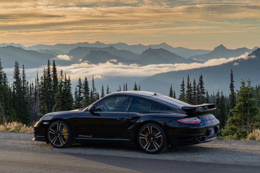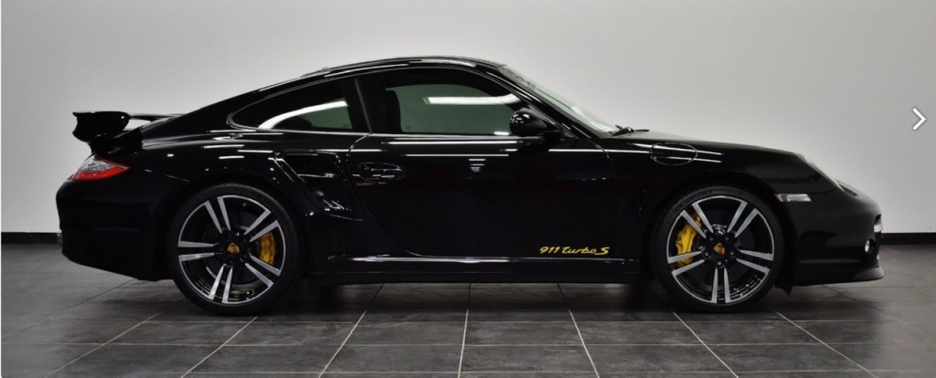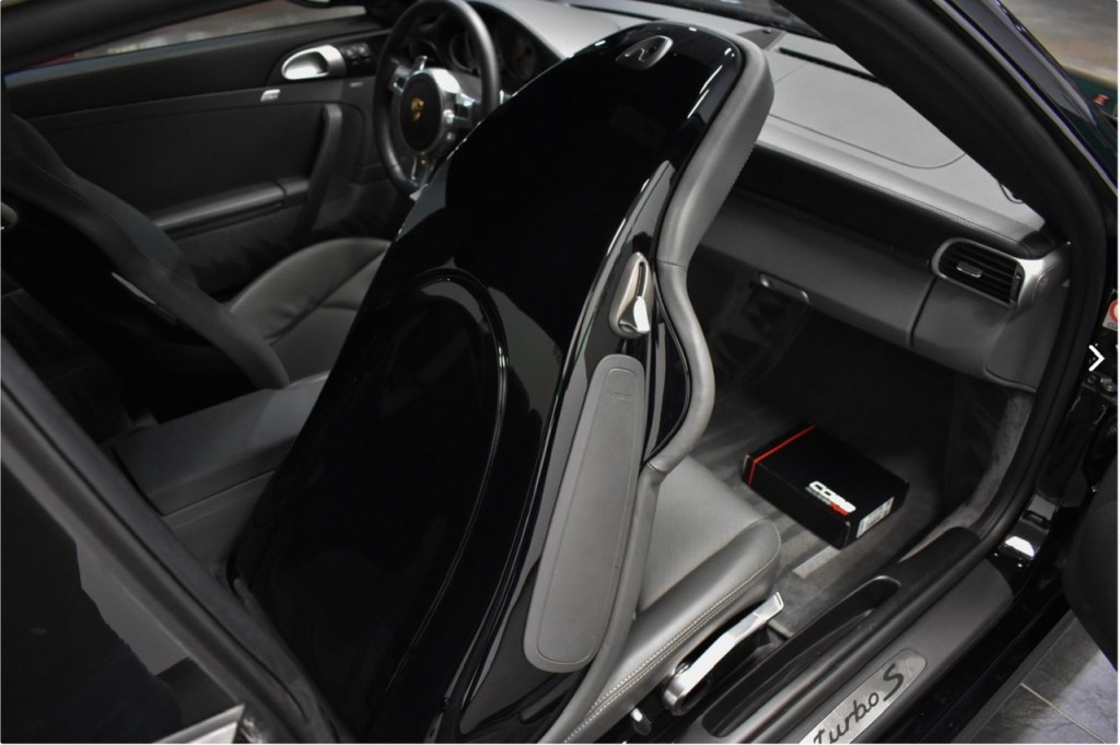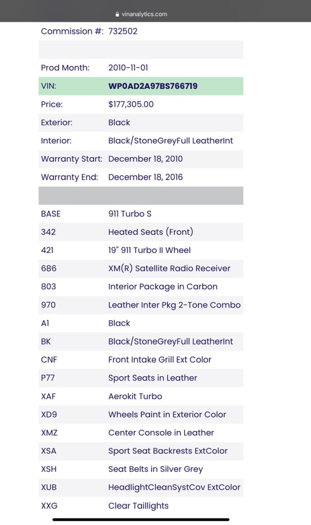 2011 Black Turbo S with black and gray two tone interior and a $177K original build price with nice touches like extended leather, leather center column, deviated stitching and belts, sport plus seats, painted rear seat shells, etc. The car has the very rare and desirable factory aerokit package which includes a more aggressive front end and a beautiful fixed rear spoiler that is a major differentiator for this car. The VIN is WP0AD2A97BS766719.