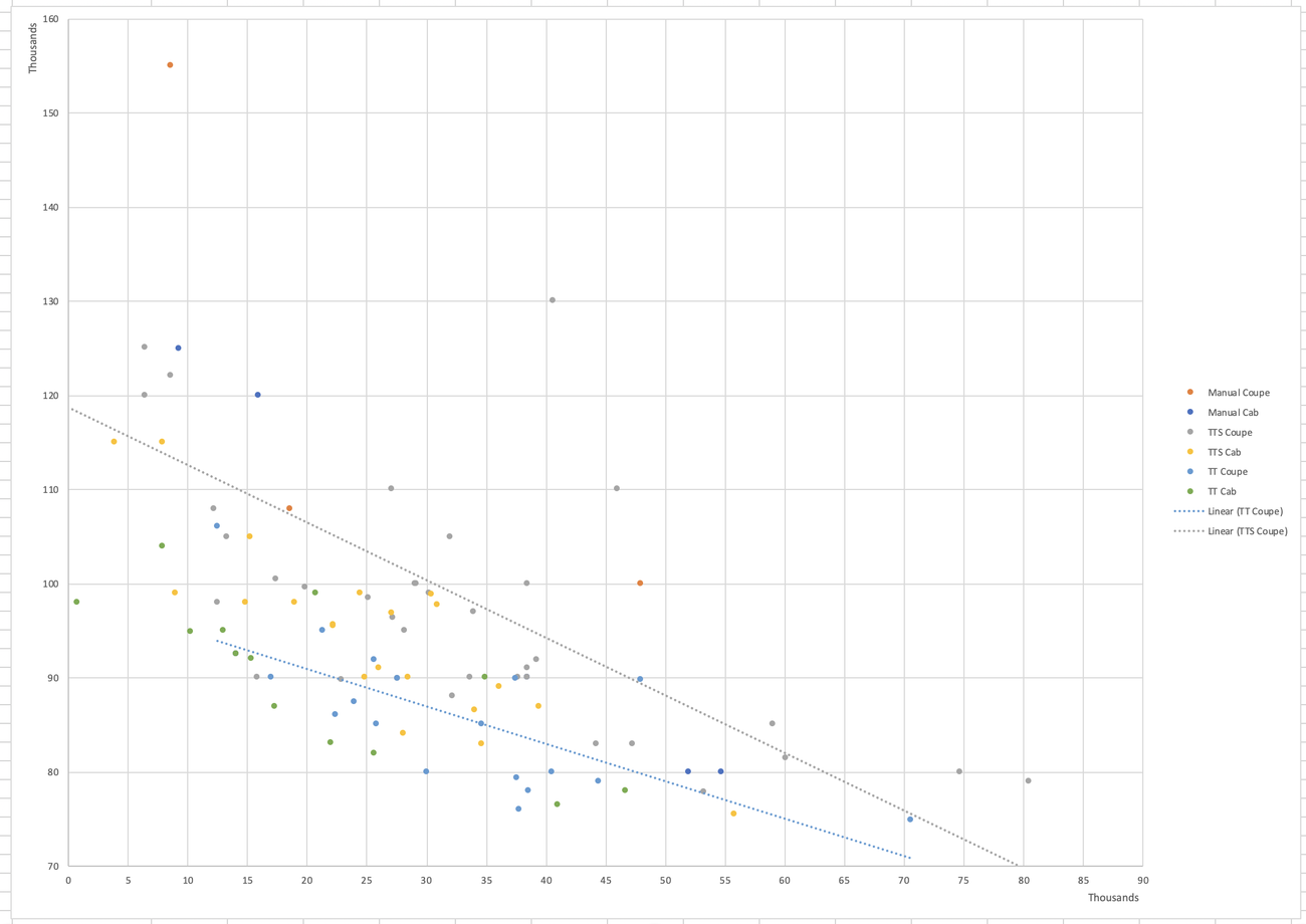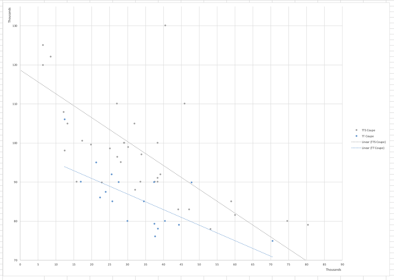 Here are the price and mileage trends followed by trends for just the coupes (click to enlarge)
