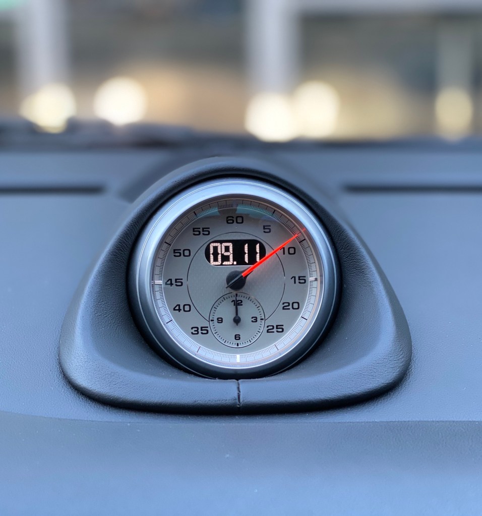 The Sport Chrono Package in a 911 comes with a bunch of fun features like sport/sport plus mode, launch control, dynamic engine mounts, etc. It also comes along with the chronometer (aka, the wart) that sits on your dash and is used in conjunction with a stick on steering column as a lap timer. Itβs basically just a very accurate stopwatch. Super cool…and I never use it. I’m sure if I did a lot of competitive track driving I would love it for the data logging. I don’t.