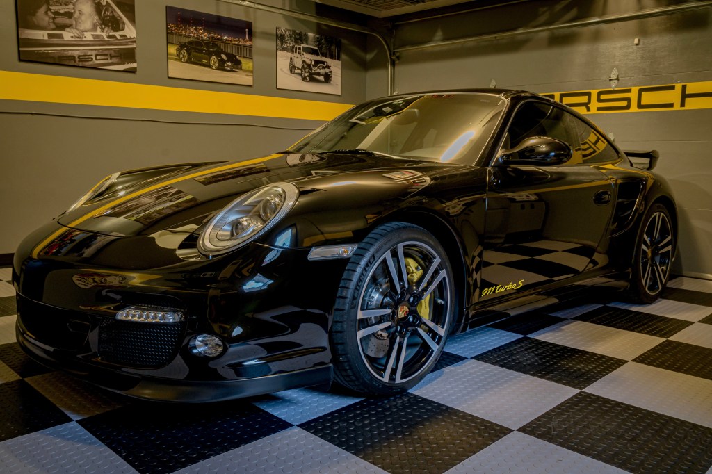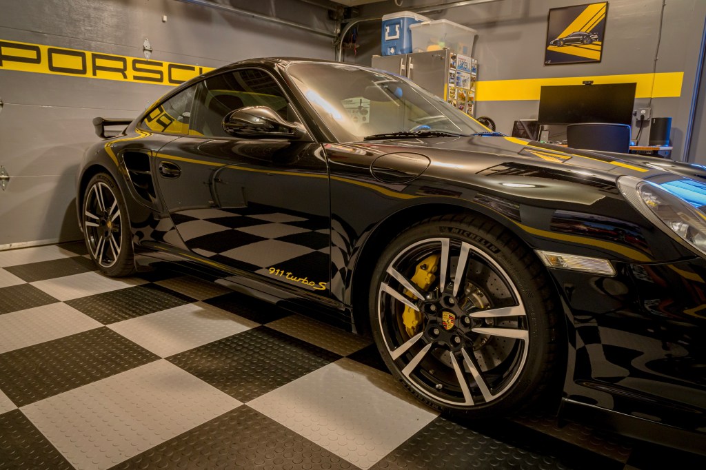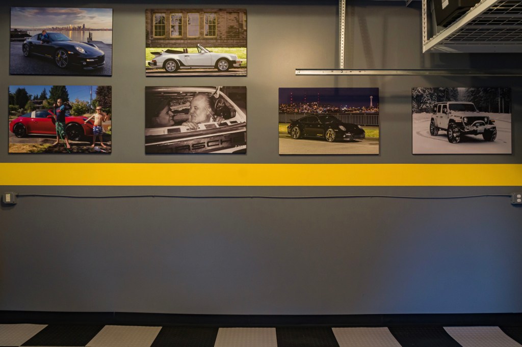Now the big reveal and a total transformation! I used a rubberized tile product from Garage Flooring Inc,. some rubberized trim, canvas prints from my car photo hobby and fun Porsche accessories that I found on Etsy. I had the painters use a gray that is close to the interior of the 911 and a yellow accent stripe that matches the yellow on the car to pull it all together. I totally love the way that this came out. It makes me smile every time I see it…and I see it a lot 🙂