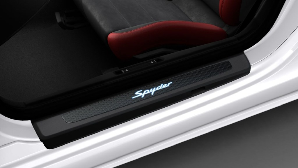 - Color – Never black, ever again. I was tempted by a bright skittles color and would have loved to do a paint-to-sample but that is complicated and expensive. None of the blues did it for me and python green or speed yellow screamed mid-life crisis more than I was willing to own. I have always loved white cars and I think the white and black two-tone look matches the Spyder beautifully. I went basic white over metallic white because to me it looks more sporty and the metallic white is too cool, I like the warmer tone of the basic white. Also free…win.