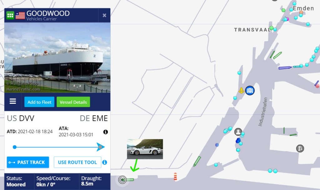 In my case, Porsche beat all of their estimates. The car was built early and was ready to ship out from Emden, Germany on March 5th on the Goodwood vehicle carrier with a updated arrival estimate at the dealership for April 16th but trending early. Thanks to the internet and sites like MarineTraffic.com, obsessed buyers like myself are able to track the progress along the way.