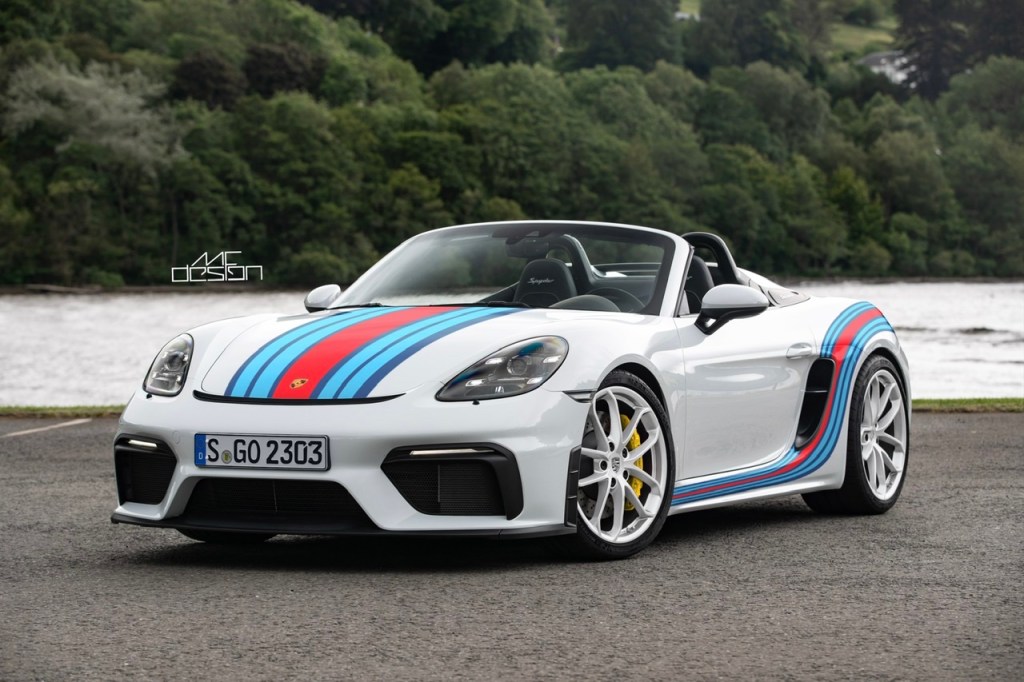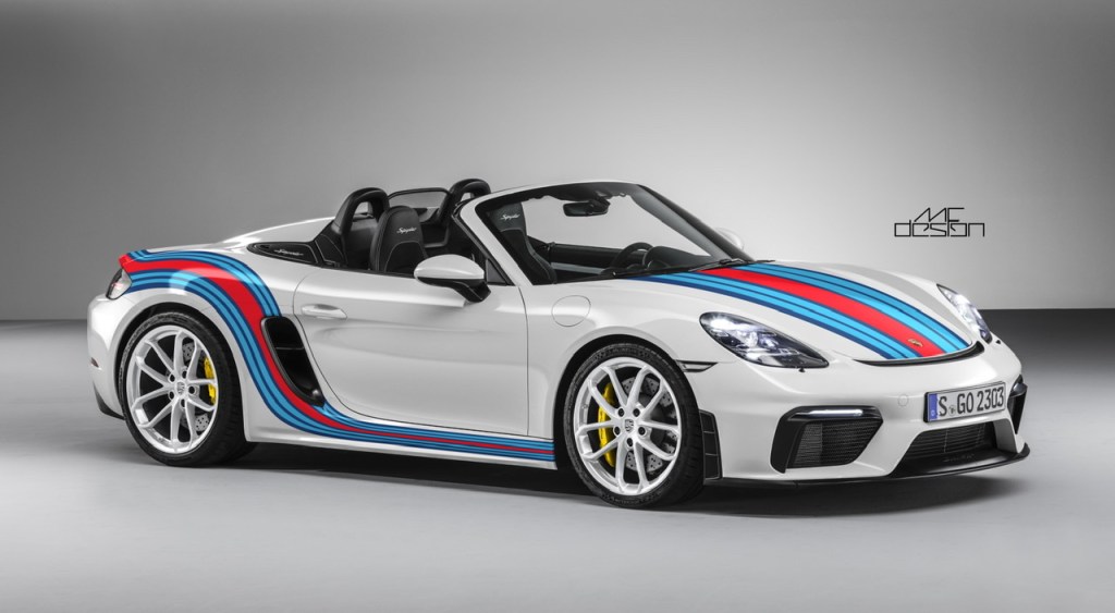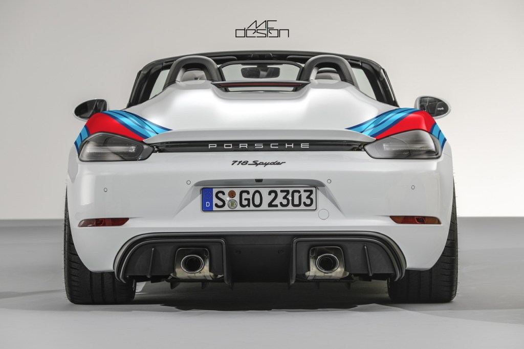 As common as it may be, Martini is my favorite and I think it accentuates the curves of the car perfectly. Personally, unless it is going on an actual race car, I think the race numbers and Martini racing team logo are a bit too much. Here are some mockups of what a Martini inspired design could look like on the 718 Spyder.