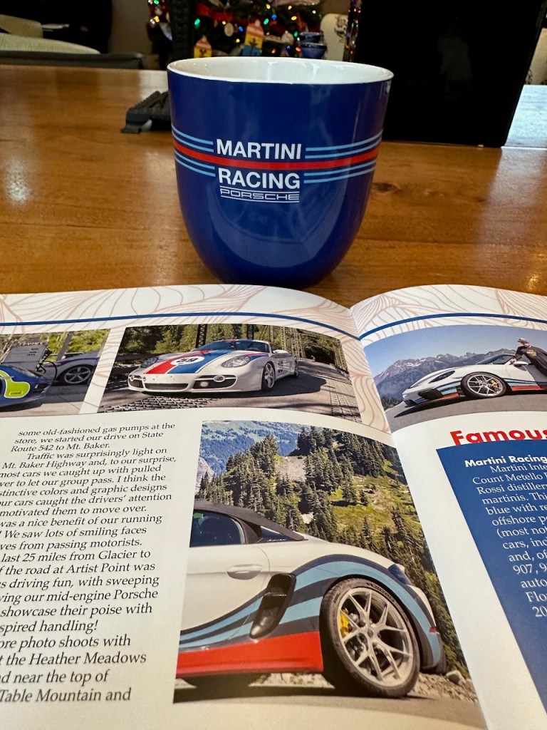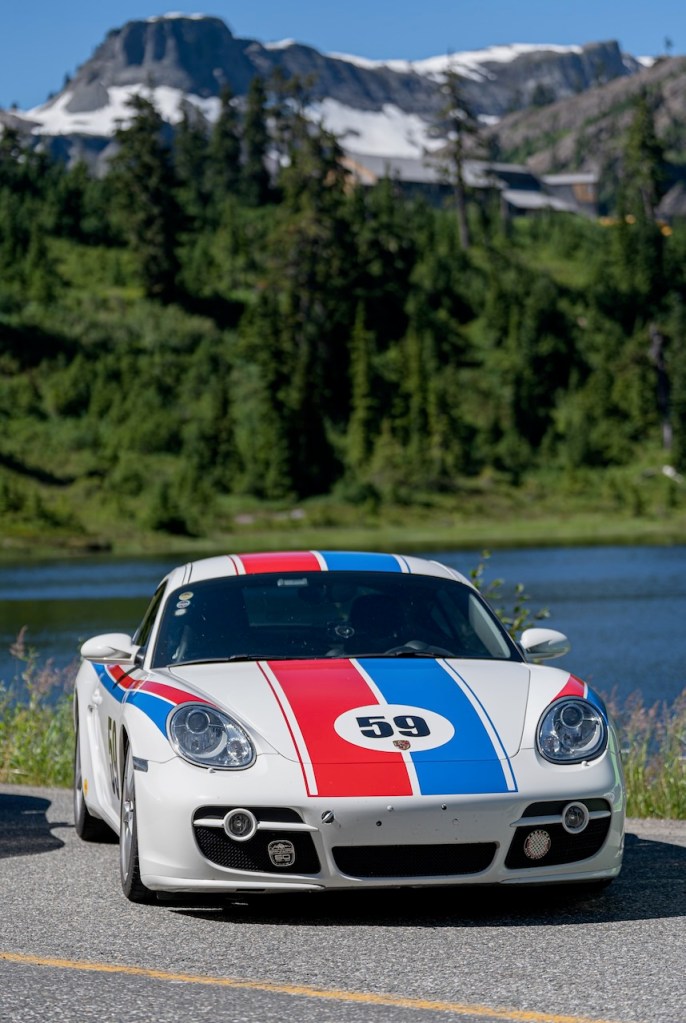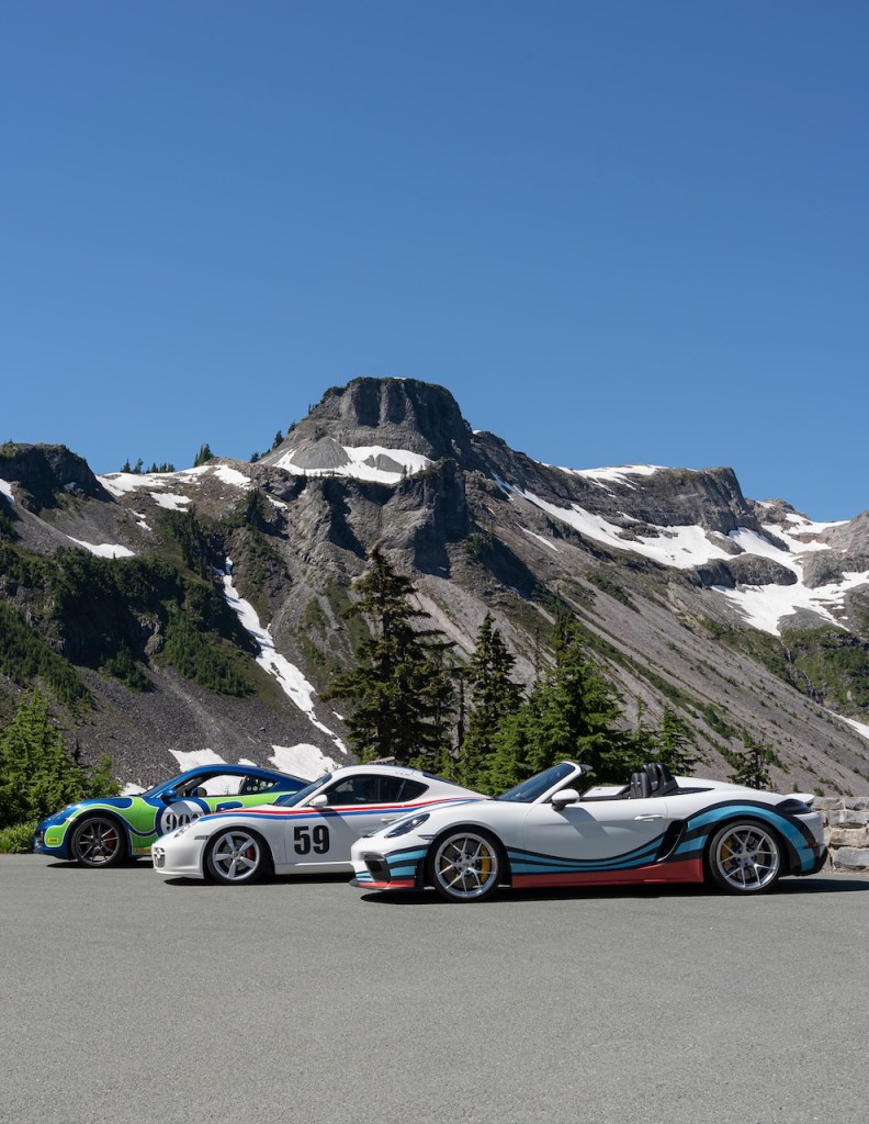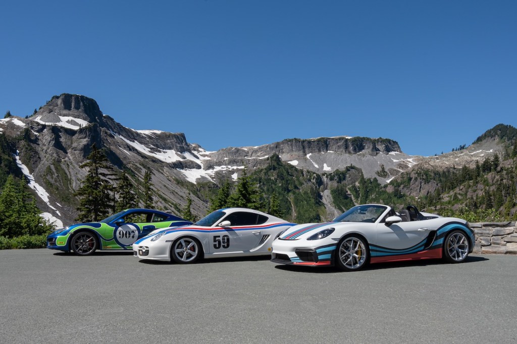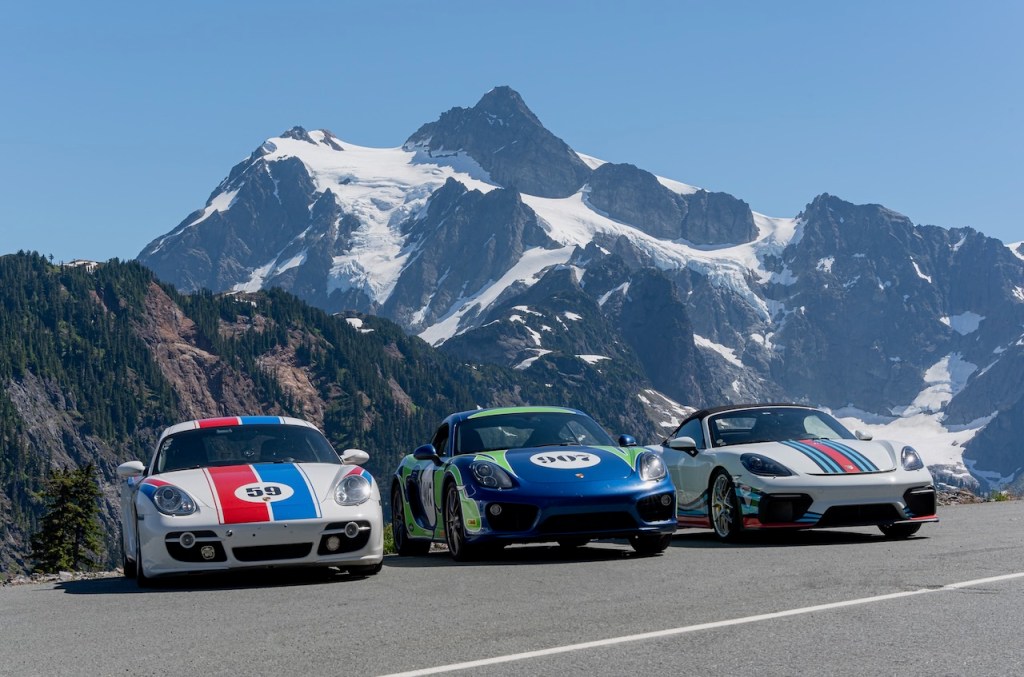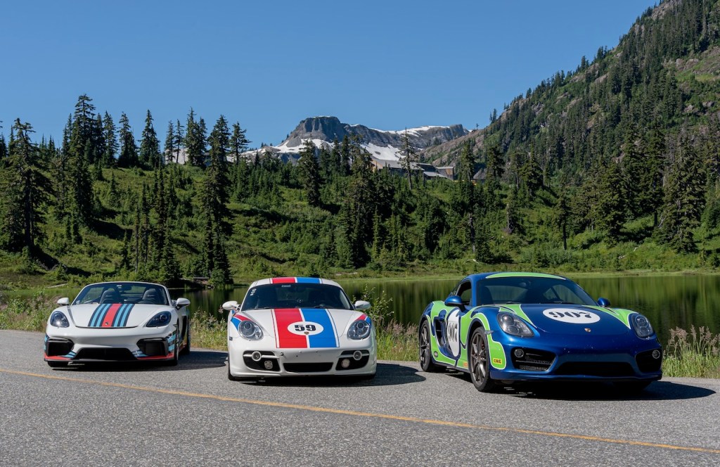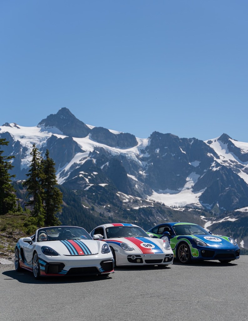 Gary has a 981 Cayman with the Martini Racing “hippie” livery which looks perfectly psychedelic. Martin has a 987 Cayman with the red and blue striped Brumos Racing livery that is a perfect match for the lines of his car. I have a modern interpretation of the classic Martini Racing team livery on my 718 Spyder. Three different generations of mid-engine Porsches and three timeless racing liveries out to have some fun.